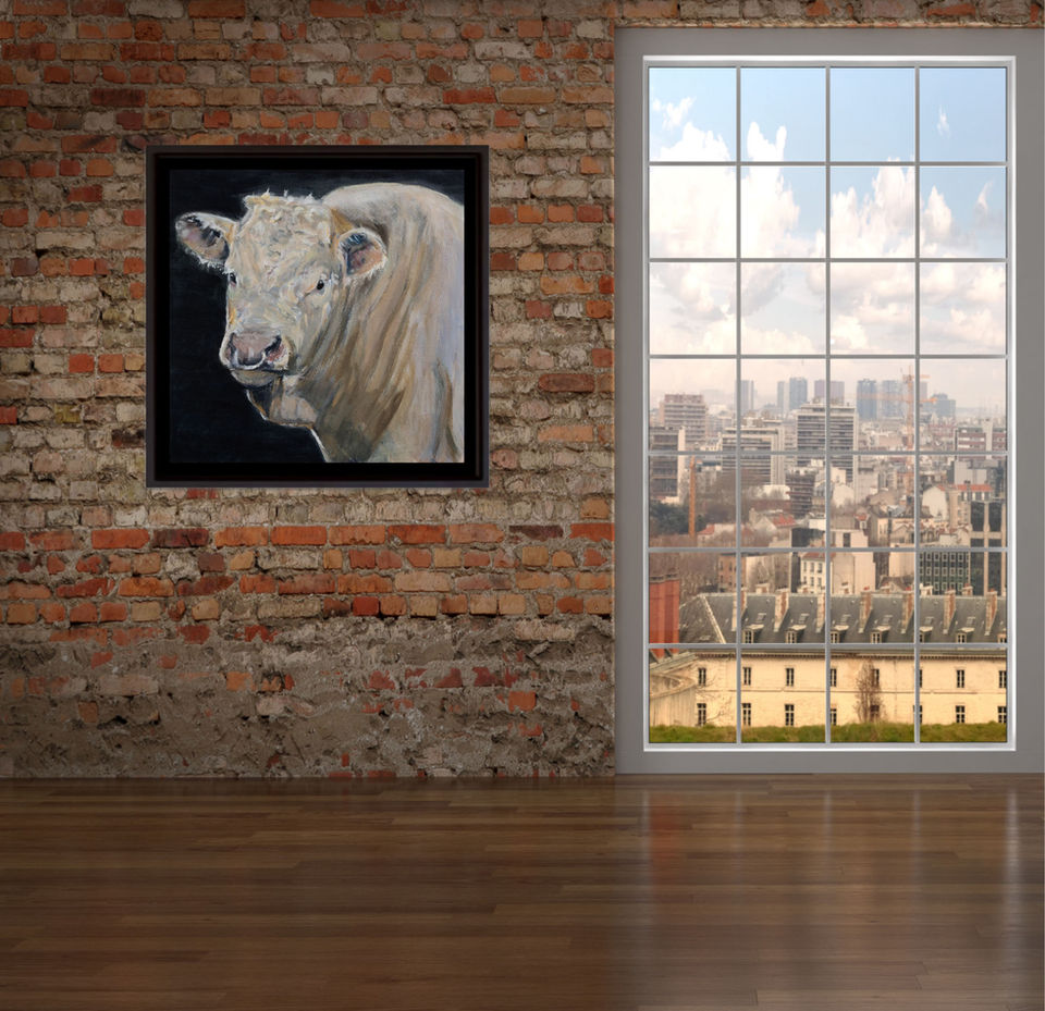 A young Charolais bull, available as both a print on paper and on canvas, available both on high quality paper and on canvas 16"x16", 20"x20" 30"x30"